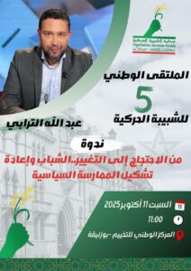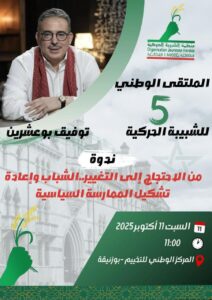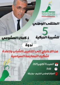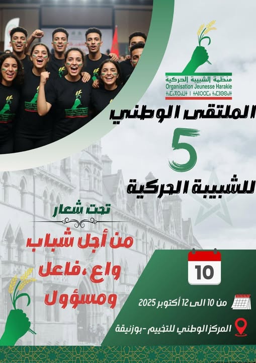 تنظم الشبيبة الحركية الملتقى الوطني الخامس تحت شعار ” من أجل شباب واعٍ، فاعل و مسؤول “، وذلك أيام 10-11-12 أكتوبر ببوزنيقة. الملتقى ، الذي سينتاقش عدة مواضيع تهم الشباب، يقدم ببرنامجا عنيا ومتنوعا، يأتي على الشكل التالي:
