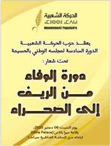 Le parti du Mouvement Populaire tiendra, le samedi 06 décembre 2025 à la salle Mira Palace à Al Hoceima, la 6ème session de son Conseil national et ce, sous le thème « La session de la loyauté, du Rif au Sahara ».
